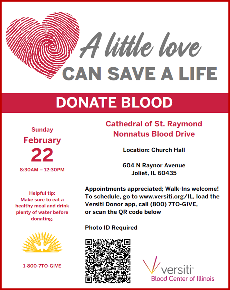 Versiti Blood Center of Illinois will be here on Sunday, February 22 from 8:30am - 12:30pm in the Parish Commons. Appointments appreciated; Walk-ins welcome! To schedule, go to www.versiti.org/Il, load the Versiti Donor app. call (800) 7TO0GIVE or use the link below. Photo ID Required
