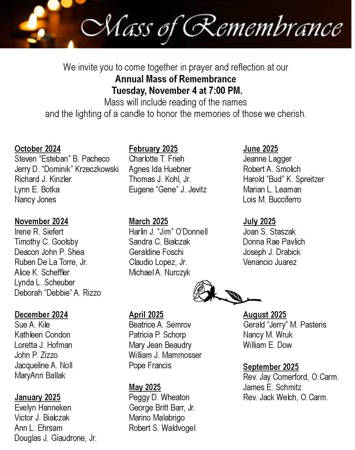 We invite you to come together in prayer and reflection at our Annual Mass of Remembrance on Tuesday, November 4 at 7:00pm. Mass will include reading of the names and the lighting of a candle to honor the memories of those we cherish.