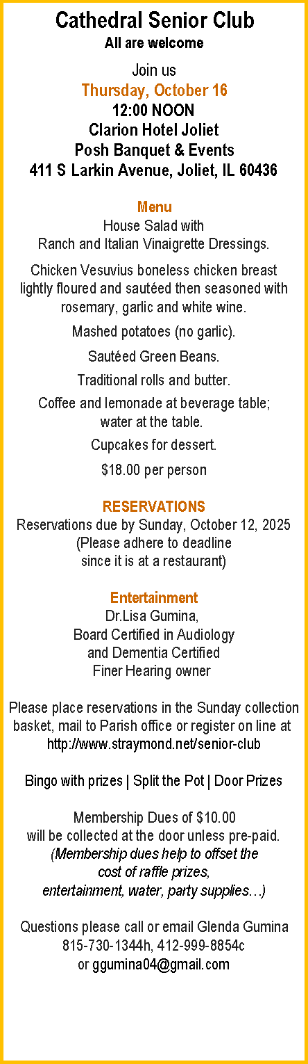 Yearly membership is just $10 and helps to offset the cost of our events. Dues are payable once a year in August. Please indicate “Senior Club Dues” on your envelope or check. Dues can also be paid online at straymond.net or at the first meeting.
